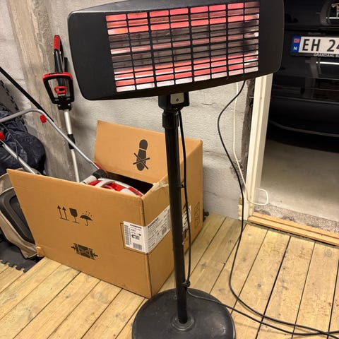 Cirka åtte år gammel terrassevarmer selges. Tre nivå av varme som styres ved snoren. Dessverre er det ikke mulig å bruke snoren til å skru den helt av, da må støpslet trekkes ut. Det er jo for øvrig den tryggeste måten å skru av et slikt apparat på. Hentes i Lillesand.