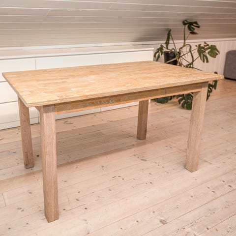 Bordplaten er 130cm rundt bord. Bordplaten er 2år gammel. Platen er dekket med dekor klebene folie som produsenten har utført. Som du ser på bilde, har litt av folie blitt skrapet vekk noen steder av kantene. Men en lett fin puss, evt. litt maling/ny folie. Er borde som ny.