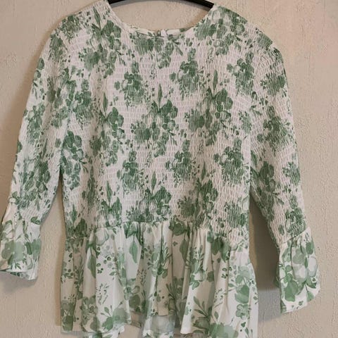 Blusen har 3/4 lang erm med en liten puff og elastikk med rysjekant nederst, samt elastikk og peplumkappe i livet.