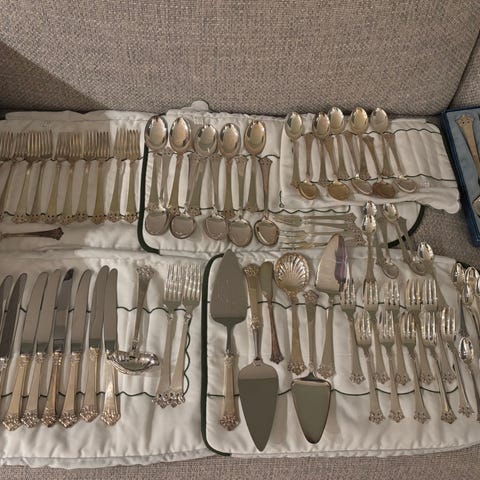 Anitra sølvtøy , kniv og gaffel, lite brukt. Bestikk i sølv 830s fra Th Olsens Eftf . Ny pris for begge er over 3.800 kr. Selges for kr 1600 samlet. Sender mot porto. Pris er satt for disse 2.