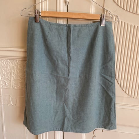 Pent kort skjørt med splitt fra Benetton. Italiensk str. 42 men passer str. 38. Pen passform. Kan steame skjørtet hvis ønskelig.