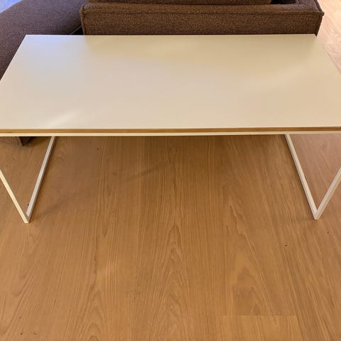 Bolia salongbord i grå betong og hvit metallramme. Bordet har et minimalistisk design med en rektangulær form og passer til stuebruk. Bordet bør pusses og oljes.