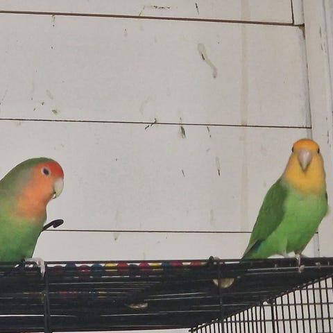 Grå er hannen som heter kokos, og grønn er hunnen som heter mango. De er sammen siden 3 år. Usikker om alders . Sikkert er over 3,5 år gamle.