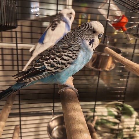 De har en liten bur. Kan selge bur også. Men de er fint at hvis ny eier har stor bur. Nå tiden de er i stor burnå og er veldig glade.