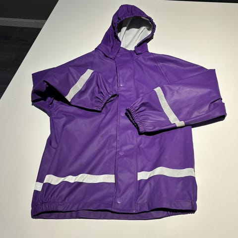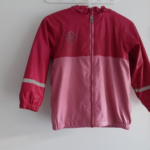 Oransje og rosa regnjakke fra Norheim str 116. Ingen slitasje eller skade, men noe skitten nederst på ryggen. Går sikkert bort med en vask.