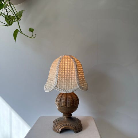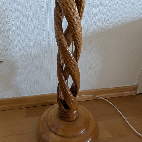 En gammel romantisk bordlampe, malt i hvit. Kan pusses og males i annen farge. 57 cm høy, foten er 13 cm på tvers, lampeskjermen er ca 28 cm på tvers.