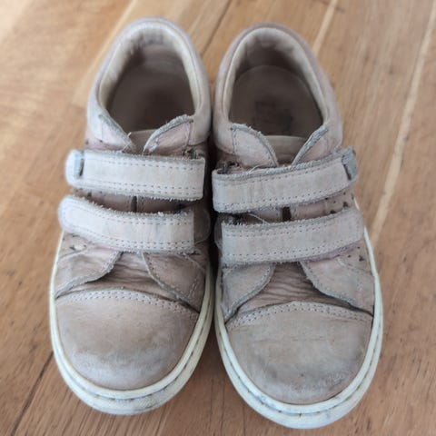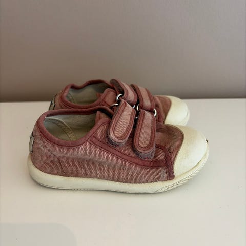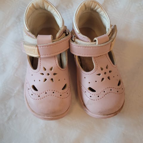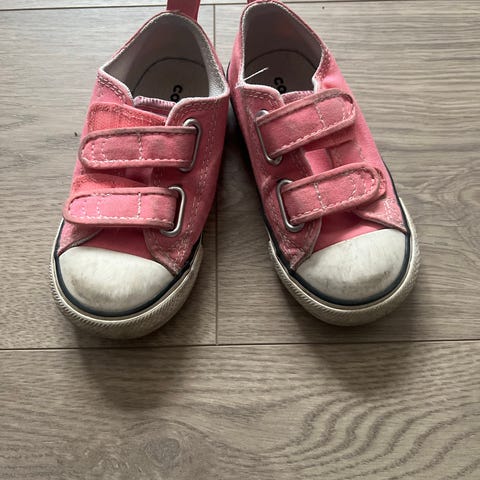 Kavat barnsko i størrelse 22, unisex. Skoene er rosa med borrelåslukking og hvite gummisåler.