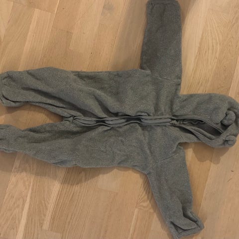 Brun bomull fleece. Knapt brukt. Str 92-98. Kan brette over føttene og hendene. Deilig sovedress eller til kalde dager. Ny pris 650