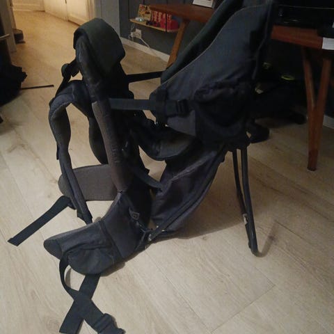 Den har justerbare stropper, polstret rygg og hoftebelte for komfort. Fargene er rød og grå, og materialet er slitesterkt tekstil. Egnet for utendørs bruk og turer med barn.