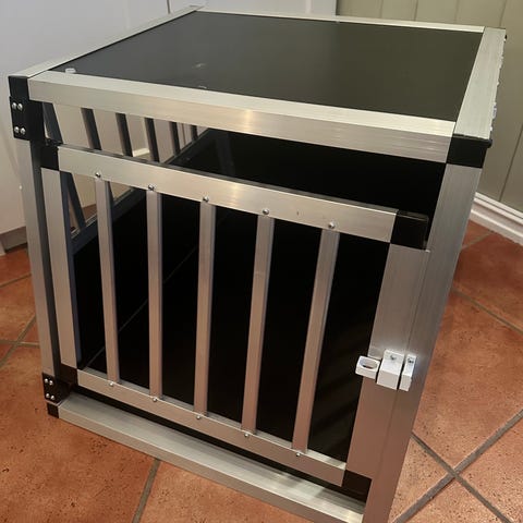 Hundebur i aluminium med dimensjoner 69x54x50 cm. Buret er laget av slitesterkt aluminium og veier 8,2 kg. Det er egnet for transport og gir god sikkerhet for hunden. Designet gir enkel tilgang med en låsbar dør.