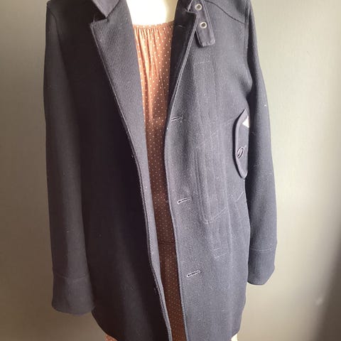 Waxed cotton, looks a bit like a barbour jacket. Not waterproof. Lovely warm insulation.