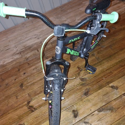 White Barne Sykkel med 16 tommers hjul, svart ramme med grønne detaljer. Sykkelen har kjedebeskytter, refleks på hjul og bak, samt justerbart sete og styre. Passer for barn og er laget for bruk på vei og i terreng.