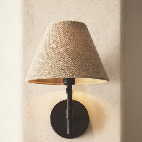 Blå vegglampe med ny håndlaget skjerm i stoff fra Studio Bazar