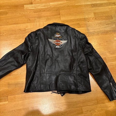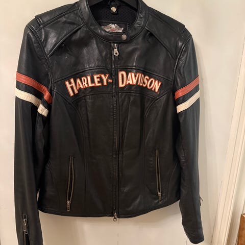 Harley-Davidson skinnjakke for herre i størrelse 54. Jakken er svart og laget av ekte skinn. Den har detaljer som Harley-Davidson-logo på bryst og rygg, samt ventilasjonspaneler på innsiden. Jakken er designet for motorsyklister og har funksjonelle lommer og glidelåser.