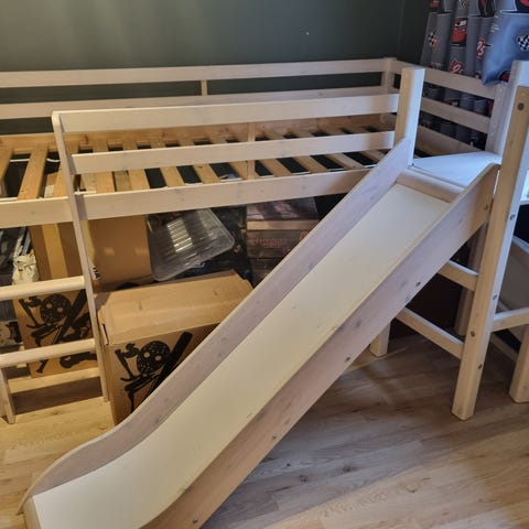 Fin og pent brukt barneseng, kan reguleres og madrass medfølger-som kan bygges på etter hvor stor sengen er. Madrassen er i 3 deler, mål: 130x80, 165x80 og 200x80cm, madrassen og sengen vokser med barnet.