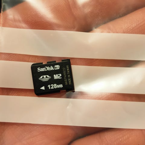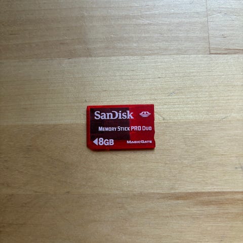 Dette er et Minnestikke (Memory Stick PRO Duo) fra merket SanDisk, med en kapasitet på 512 MB.