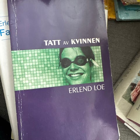 Erlend Loe Tatt av kvinnen er en bok. Omslaget er lilla med bilde av en kvinne med solbriller. Boken er skrevet på norsk.