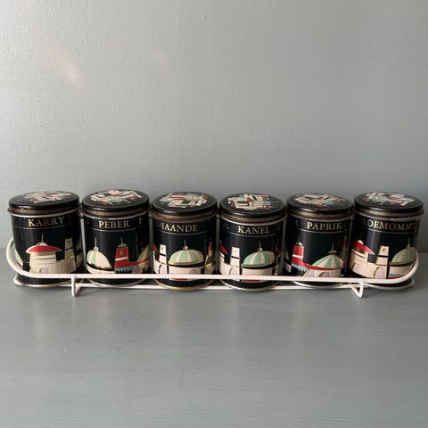 Dekorativt vintage krydderstativ med fire glassbeholdere til salt, pepper, sennep og olje/eddik og liten skje.