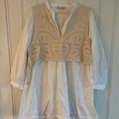 Nydelig heklet blondekjole i 100 % bomull, modell Cayline. Kort til låret, med flatterende passform og sorte kontrastknapper i front. Brukt få ganger – i svært god stand.