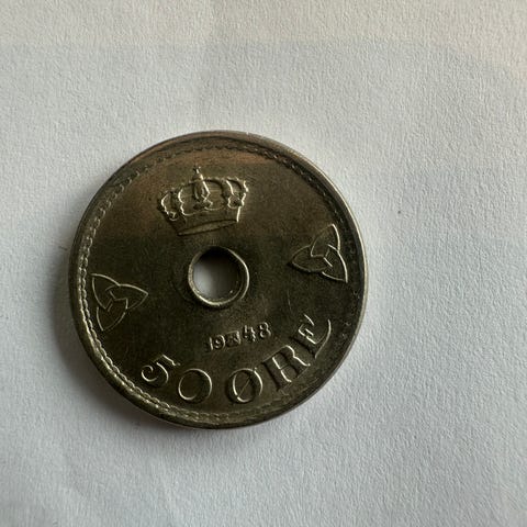 Norsk 50 Øre mynt fra 1927 med hull i midten. Mynten har kongekrone og inskripsjoner på begge sider. Laget av metall og brukt som valuta i Norge.