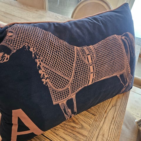 Nydelig fløyelsputetrekk 60 x 40 cm, i Dusty blue stigbøyle /ryttermønster.