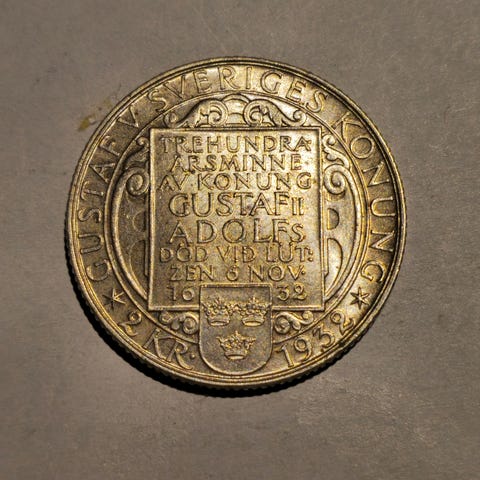 Sverige 2 Kr mynt fra 1926. Myntens forside viser profil av Gustav V med innskriften "GUSTAF SVERIGES KONUNG". Baksiden har riksvåpen og teksten "MED FOLKET FÖR ÖSTERLANDET .