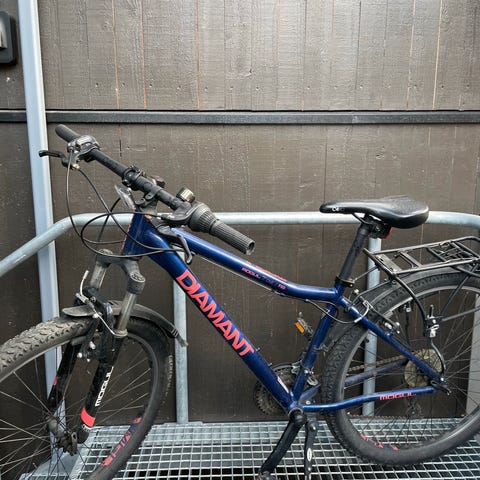Diamondback Stratus terrengsykkel med 16 tommers ramme i 7005 aluminium. Sykkelen er beige og utstyrt med Shimano RevoShift girsystem. Egnet for terrengsykling og fritidsbruk.