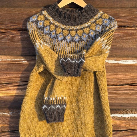 Strikket i lettlopi, som er 100%ull. H:61 B:49 Erm:46