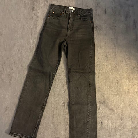 Jeans fra Gina Tricot i straight modell med høyt liv. Frynsete ender på beina. Farger er gråsvart. I god stand, kun brukt et par ganger og har så blitt liggende da de er litt trange til meg