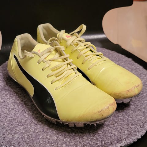 Puma Evospeed Tokyo Nitro 400 løpesko i størrelse 42. Skoene er oransje og designet for løping. Materialet og sålen er tilpasset for å gi grep og ytelse på bane. Leveres med oppbevaringspose merket Track & Field. Skoene er med faste pigger og selges kun fordi brukeren har vokst ut av de. Fint brukt. Skoene egner seg fra 60 meter opp til 400 meter sprint.
