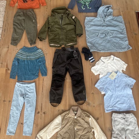 Klærne er brukt men har ingen hull og ikke mye slitasje (bortsett fra føttene/strikkene).