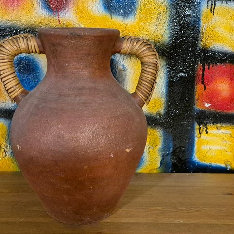 Selger en dekorativ keramisk vase i brun farge med strukturert mønster. Passer fint som pyntegjenstand eller til blomster.