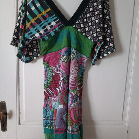 Desigual kjole til spesiell anledning i størrelse L for kvinner. Kjolen har et flerfarget mønster med detaljer i svart og fargerike elementer, inkludert blomstermotiv og regnbuefarger. Materialet består av 100 % viskose, med et overlag i polyester og nylon. Kjolen har kort erme og en kombinasjon av mønstre og farger som gjør den egnet til spesielle anledninger.kjolen er merket str 44 men er ikke stor i str