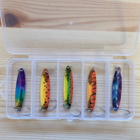 Vekten varierer på de ulike slukene, spinnerne og skeislukene. Men de ligger nok på et sted mellom 1-15gram. Perfekt størrelse for ørretfiske og ferskvannsfiske.