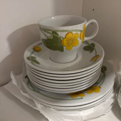 Nydelig, sjeldent Bekkeblom frokostservise fra Figgjo Flint selges rimelig. Fantastisk velholdt, uten skader (med unntak av et ørlite neg i lokket på tekannen) og med pen glasur. Bruksmerker forekommer. Består av 34 deler: