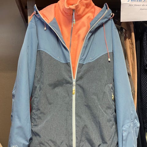 Alpin jakke for dame i størrelse L, Oppleves liten i str. Feminint snitt. Lyseblå farge. Jakken har hette med justerbar snor, glidelåslukking foran, og flere lommer med klaff. Materialet er lett og egnet for utendørs bruk.