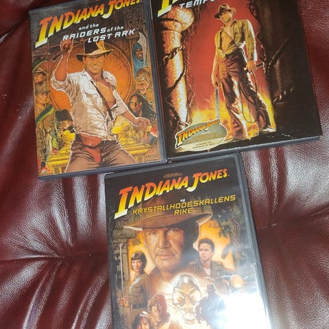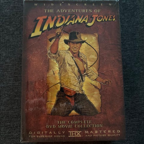 Indiana Jones DVD Movie Collection komplett sett med alle filmene i serien. Inkluderer titler som "Jakten på den forsvunne skatten", "De forbudte tempel", "Korsfarer" og "Siste korsstog". Settet leveres i en samleboks med illustrert omslag.