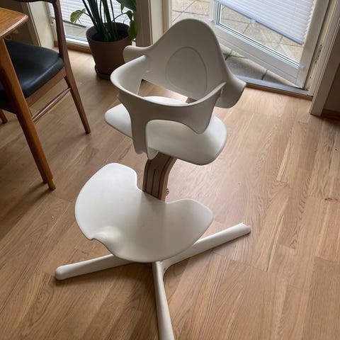 Pent brukt av ett barn Stokke Nomi barnestol med tilbehør. I lys eik, hvitt og grått.