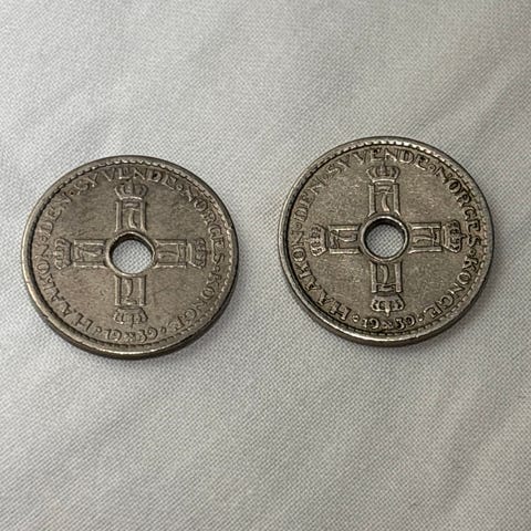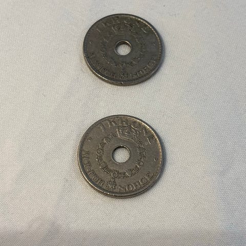 Norske mynter bestående av fire 25 øre mynter med hull i midten og to 1 krone mynter fra 1959. Mynter er laget av metall og viser tradisjonelle norske motiver. Passer for samlere eller som historisk valuta.