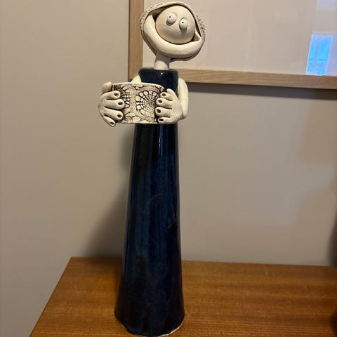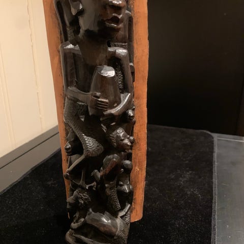 Keramikk vase med svart og naturfarget finish. Vasen har en dekorativ overflate med relieffmønster og signatur. Egnet som dekorativ gjenstand i hjemmet. 29cm høy, største omkrets er 47cm. kjøpte på en kunstforening i Hegdehaugsveien for ca 28 år siden.