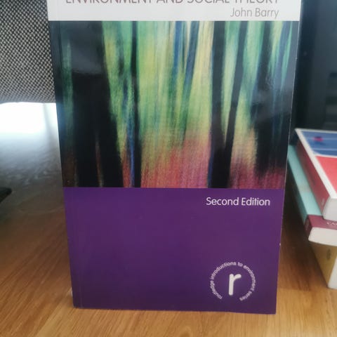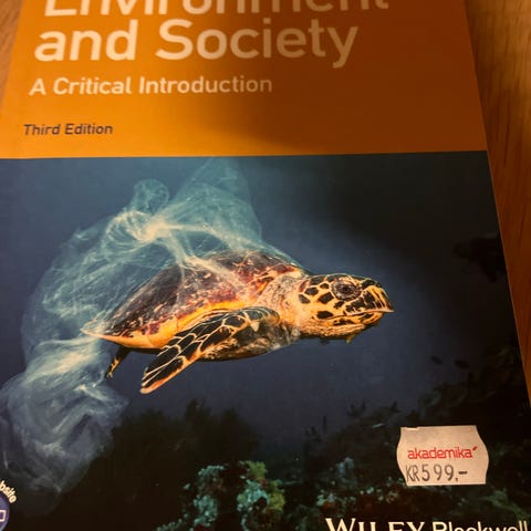 Wiley Blackwell Environment and Society textbook titled 'Environment and Society: A Critical Introduction', third edition. The book covers topics related to samfunnsfag (social studies) with a focus on environmental issues and their societal impacts. It includes detailed text and highlighted sections for in-depth study.