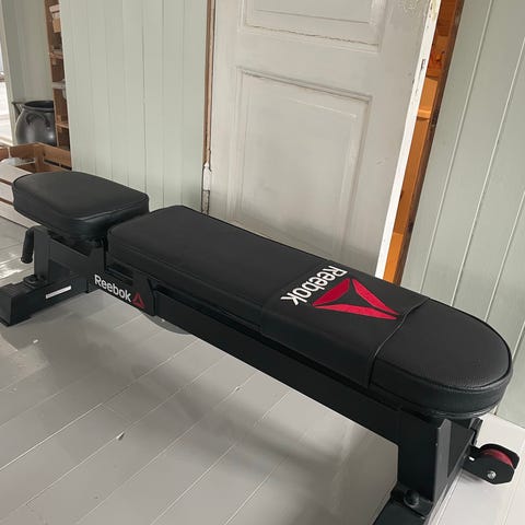 Reebok treningsbenk med justerbar ryggstøtte. Farge: svart og rød. Materiale består av polstret sete og ryggstøtte med gummibelagt overflate for bedre grep. Benken har oppbevaringsrom under setet. Egnet for ulike styrke- og kondisjonstreninger.