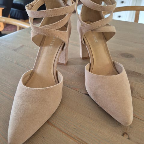 Bianco pensko i størrelse 37. Laget av dus rosa semsket materiale med åpen tå og tynne kryssende stropper foran. Hæl med middels høyde og spenne rundt ankelen for justering.