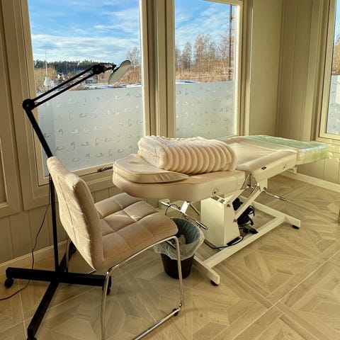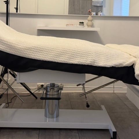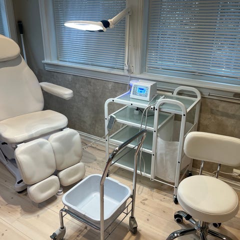 Pasientstol til fotterapi, elektrisk opp/ned/vippefunksjon/kan legges ned som benk. Fotstøtte er manuelle. Kjenner ikke til produktnavn. Stolen er av eldre modell, men har ikke vært brukt mye.