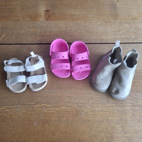 Alle er pent brukte, noen har mer bruksmerker enn andre! De rosa er str 24, resten er str 23.