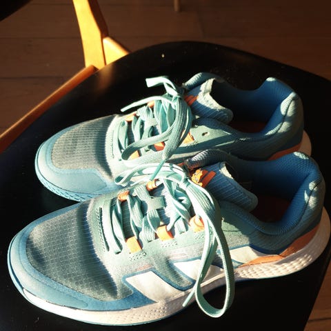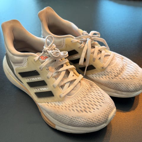 Adidas 3Bounce sportssko i størrelse 42 2/3 designet for allsidig bruk. Skoene har en hvit overdel med blå detaljer og en gummisåle for godt grep. Materialet gir pusteevne og komfort under aktivitet. De er litt slitt ved Helen men dette påvirker ikke løping eller annen sport.