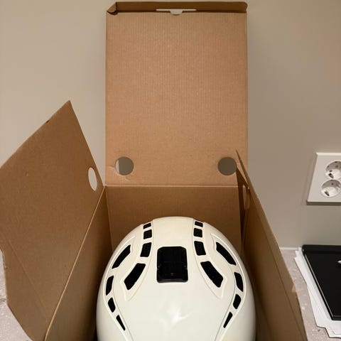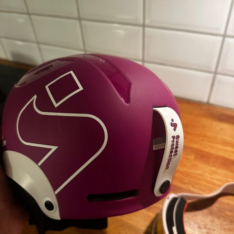 Kul Sweet protection hjelm, sjøgrønn med oransje detaljer, noen kule klistremerker og feste til go-prokamera. Str M/L