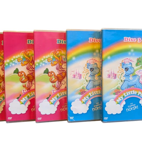 My Little Pony Høstå Tale VHS-kassetter med titlene "Opp i det blå!" og "Rock 'n Roll!". Inneholder animasjonsfilmer med My Little Pony-karakterer. Passer for barn og samlere av barneunderholdning på VHS-format.