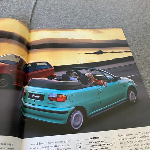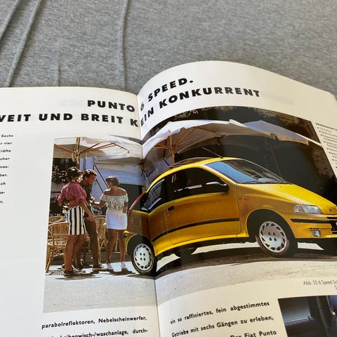 Fiat Punto brosjyre. Trykt salgs- og informasjonsmateriell med bilder og teknisk informasjon om Fiat Punto-modellen. Viser eksteriørdetaljer, felgalternativer og ulike vinkler av bilen. Egner seg som referanse for bilinteresserte, samlere av bilbrosjyrer eller eiere av Fiat Punto som ønsker originalt informasjonsmateriell.