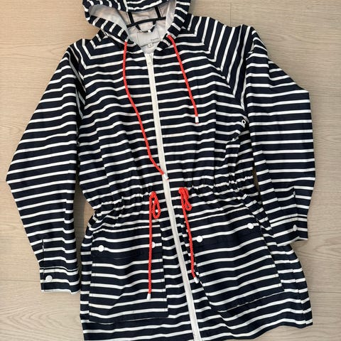 Regnjakke for dame i størrelse S. Blå-og hvitstripet. Jakken har hette med røde snorer, glidelås foran og knappelukking på lommene